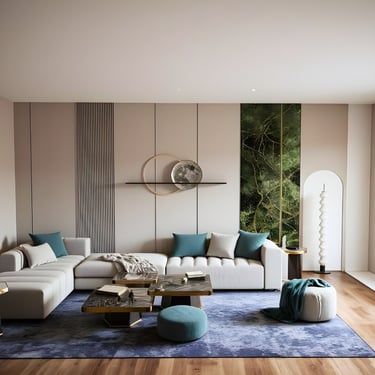 The design features a bright, modern living room with soft textures, minimalistic paneling, and elegant decorative elements.