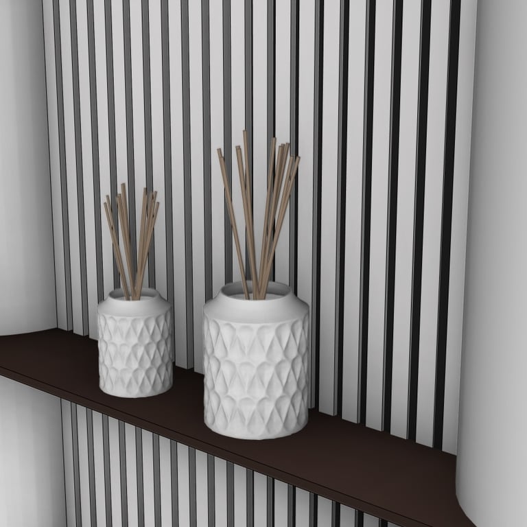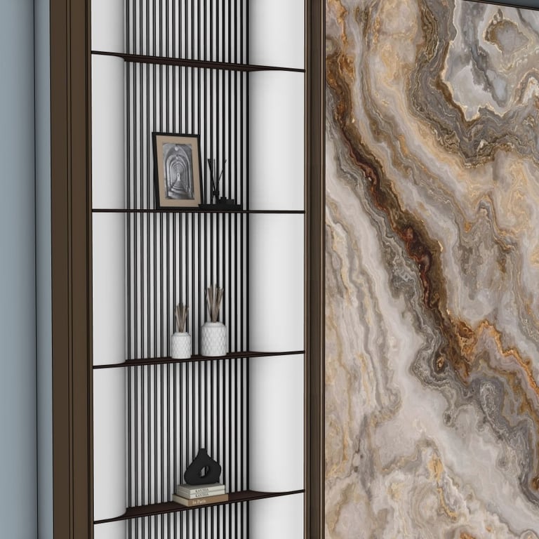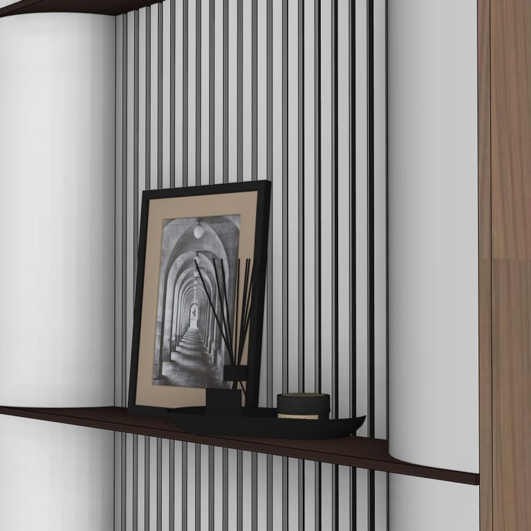 The focus of this lesson is on clean geometry, decorative shelving, and the use of natural stone textures to create a modern and stylish feature wall.